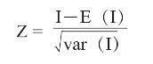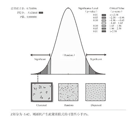 Moran’s I指数在[-1,1]区间内,等于0表示无空间自相关,大于0表示存在空间集聚,小于0表示存在空间发散分布。通常需要对Global Moran’s I值进行显著性检验,其公式为: