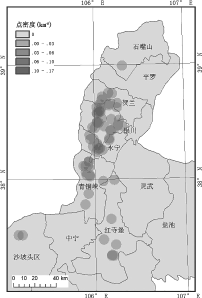 计算结果得到R=0.71,z得分-5.424641,p值趋近于0,通过1%显著水平检验,表明酒庄在局部呈集聚分布(如图6.16)。继而通过点密度分析对局部集聚的区域进行可视化显示,得到酒庄集聚分析图。由图6.16可知,贺兰山东麓的酒庄高密度区主要分布在银川、永宁、贺兰和青铜峡,石嘴山、红寺堡等地区酒庄相对较少。