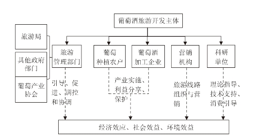 葡萄酒产区一般包含农场、林场、乡镇和村庄居民点以及一些农业用地,政府、企业、科研院所、当地居民和旅游者构成了多元化的利益主体。多种类型的用地结构、多头管理与多元利益格局决定了葡萄酒旅游开发工作的复杂性、综合性。为避免利益主体“遍地开花,同质化竞争”“各自为政,力量分散”的局面,可以建立“葡萄酒旅游管理部门+行业协会+技术发展联盟+项目企业化运作+经营服务市场化”的组织运作模式,如图7.3。统筹协调好各利益主体之间的关系,从旅游可持续发展的高度规划葡萄酒旅游业态,在保护和利用乡村旅游资源和旅游环境的基础上,注重社区居住空间和旅游发展空间的优化整合与重组,最大限度地实现生态、经济、社会三大效益的有机统一,实现各方利益的长远发展和共赢。