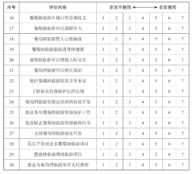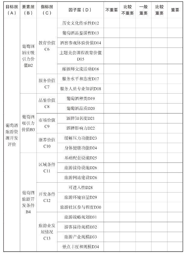 非常感谢您在第一轮葡萄酒旅游资源开发评价指标遴选工作中给予的支持,我们正在进行第二轮指标遴选研究工作,需要您的配合。以下表格是修正后重建的葡萄酒旅游资源评价指标体系,请您根据对每个因子的理解,就其葡萄酒旅游资源开发的重要程度在每个因子对应的方框下打“√”。谢谢您的配合!如果您有更好的意见或者建议,请及时与我们联系!