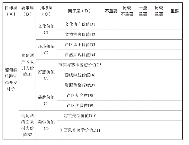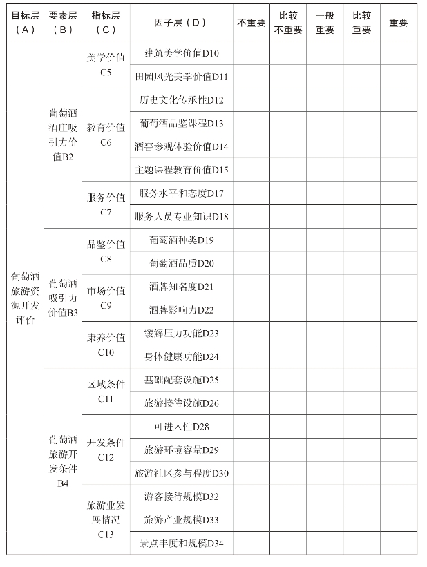 我们正在进行一项葡萄酒旅游资源开发评价指标遴选研究工作,需要您的配合。以下表格是初步构建的葡萄酒旅游资源评价指标体系,请您根据对每个因子的理解,就其葡萄酒旅游资源开发重要性在每个因子对应的方框下打“√”。谢谢您的配合!如果您有更好的意见或者建议,请及时与我们联系!