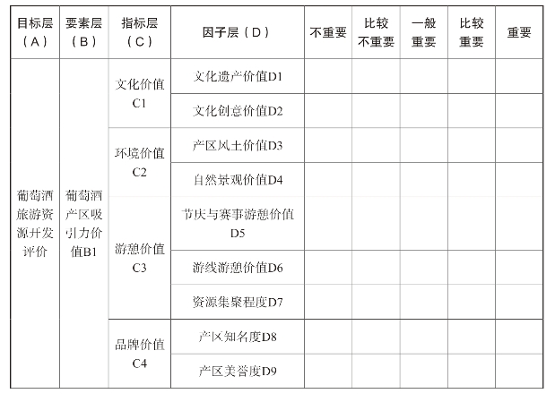 我们正在开展葡萄酒旅游资源开发评价指标权重计算的研究,请您用层次分析法(AHP)对各指标相对重要性赋值。各层次指标两两比较结果使用标度数值表示,同等重要、稍显重要、明显重要、重要得多、极其重要的标定值分别为1、3、5、7、9,介于其间的分别以2、4、6、8来标定,而稍不重要、不重要、很不重要、极不重要则对应取1/3、1/5、1/7、1/9。