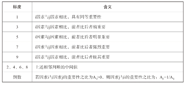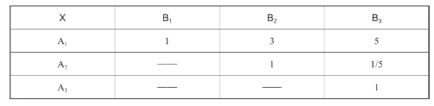 左边表格中,对于X而言,如果某位专家认为B2比A1稍重要,可以赋值3;B3比A1明显重要,可赋值5;认为B2比A2明显不重要,可以赋值1/5。