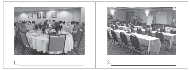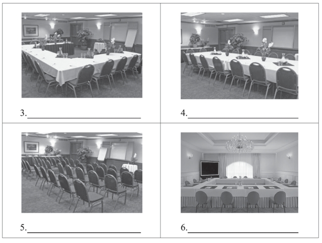 Talk about the types ofmeeting/banquet room setups.Put down a proper term under each seating arrangement.