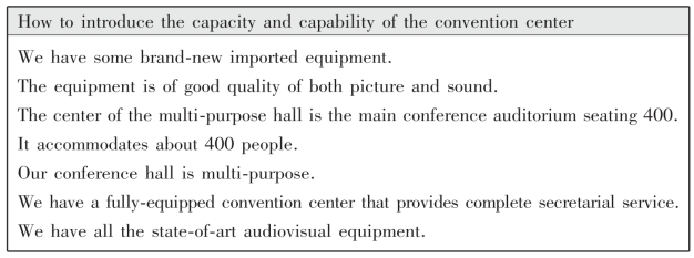 2.The sales departmentmanager is accompanying themeeting planner to inspect the Conference Hall in the Fortune Hotel's convention center.The convention servicemanager is demonstrating the electronically operated furniture and AV(Audiovisual).