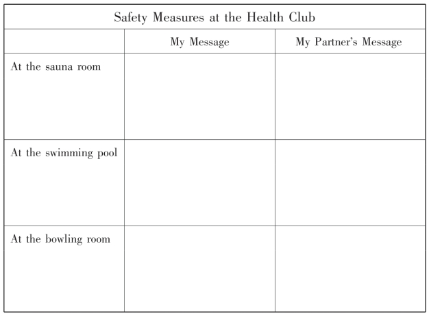 Talk in pairs about the safety m easures at the health club,and then fill in the grid with relevant information.Exchange your message orally and take notes while your partner is speaking.