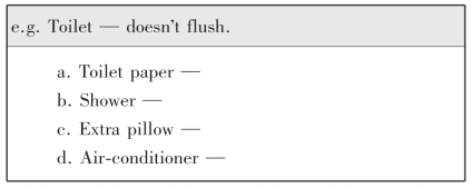 Guest:Yes.Did you have this room checked beforewemoved in?There's not a scrap of toilet paper and the toilet doesn't flush,the water doesn't run in the shower and Iwould like an extra pillow.What have you to say about that?