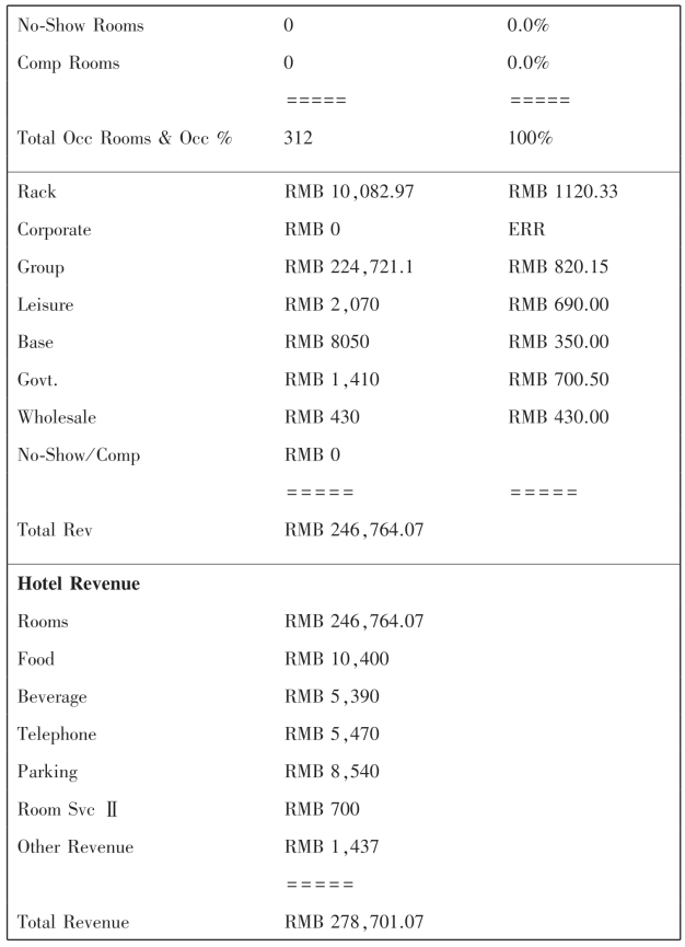 The daily report contains some key operating ratios:room occupancy percentage(ROP),which is rooms occupied divided by rooms available.Thus,if a hotel has 850 rooms and 622 are occupied,the occupancy percentage is 622÷850=73.17 percent.If 375 of the 622 occupied rooms are occupied by two ormore persons,then the double or multiple occupancy percentage is calculated as follows:dividing the number of rooms occupied bymore than one guest by the number of rooms occupied,i.e.375÷622=0.603 or 60.3%.The average daily rate(ADR)is,together with the occupancy percentage,one of the key operating ratios that indicate the hotel's performance.The average daily rate is calculated by dividing the rooms revenue by the number of rooms sold.If the rooms revenue was RMB 75,844 and the number of rooms sold was 662 then the ADR would be RMB 122.See the following figure for an example of a daily report.