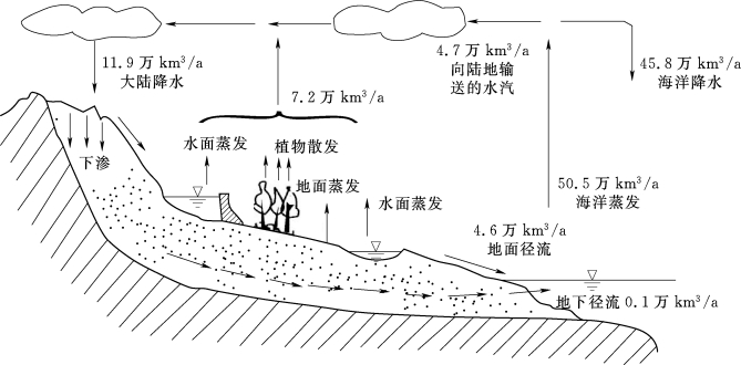 自然界的水文循环是地球上一个重要的自然过程,它通过降水、蒸散发、下渗、地面径流与地下径流等环节,将大气圈、水圈、岩石圈与生物圈联系起来,并在它们之间进行水量和能量交换。正是由于水文循环,大气水、地表水、土壤水和地下水之间才能相互转化,形成不断更新的统一系统。也正是由于水文循环作用,水资源才能够成为可再生资源,才能被人类及一切生物持续利用。