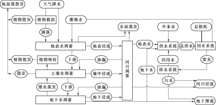 水是人类社会生存和经济社会发展的重要基础资源。随着人类活动的加强,如水利工程的兴建和都市化的发展,极大地改变了天然水文循环的降水、蒸发、入渗、产流、汇流等过程。人类取用水和排水过程已经严重影响(或干扰)到自然界的水文循环,许多流域在天然降水并未减少的情况下出现了河流断流、湖泊干枯、地下水枯竭等问题。这些问题说明在天然降水尺度的水文循环研究中已经不能忽略经济-社会系统对水文循环的干扰作用与影响。有的学者提出“人类社会的水文循环”的概念,它是指人类在社会活动中不断地取水、用水和排水而产生的人为水循环过程。严格地讲,它是依附于自然水文循环的一个组成部分,或是一个环节、分支(如同降水、蒸散发、下渗等环节),而不是一个独立的水文循环过程。它主要包括人类从自然界的取水过程、用水过程和向自然界的排水过程。水的自然循环和社会循环是交织在一起的,水的社会循环依赖于自然循环而存在,同时又严重干扰自然界的水文循环。从“天人合一”和“人与自然协调发展”的角度,应当将水文循环研究纳入到“天然-人工”这个更为完整的水文循环体系中(图2.2)。