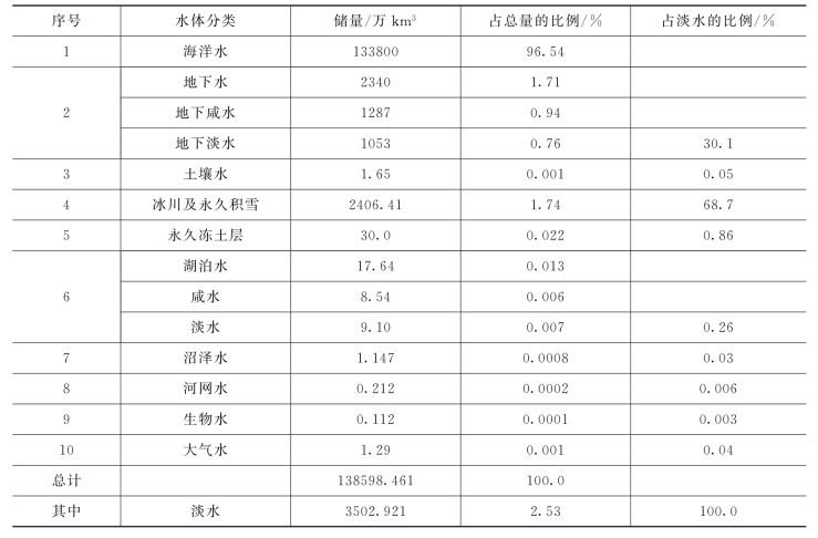 根据联合国教科文组织1978年公布的资料,地球上水的总储量为13.864亿km3,其中,地表水为136225.4万km3,占地球总水量的98.2889%,地下水为2371.65万km3,占地球总水量的1.71%;生物水为0.112万km3,占地球总水量的0.0001%;大气水为1.29万km3,占地球总水量的0.001%,其量虽小,却是各种水体中最活跃的,大气水因降水而减少,却又通过各种水体的蒸发而得到补充,保持着动态平衡,见表2.1。