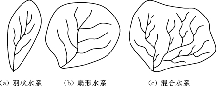 自然形成的水系形状千变万化,归纳起来主要有3种:一是羽毛状水系;二是扇形水系;三是混合水系,如图3.6所示。羽状水系的支流自上游向下游在不同地点依次汇入干流,相应的流域形状多为狭长形。扇形水系的支流大体呈平行状与干流交汇,相应的流域形状多为扇形。混合水系的支流与干流的关系介于前二者之间,相应的流域形状也介于狭长形和扇形之间。