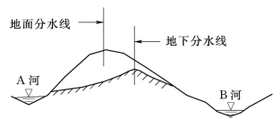河流水源包括地面水和地下水,因此分水线有地面分水线与地下分水线之分。流域的地面分水线和地下分水线一般大体一致,但有时受流域上的水文地质条件和地貌特征的影响,地面分水线与地下分水线可能不一致,表现在垂直方向上不重合,如图3.11所示。流域的分水线通常并不是固定不变的,一是由于河流的向源侵蚀而发生的相邻流域的袭夺现象,分水线的位置会发生改变;二是由于人工开挖河道,或跨流域引水等人为措施会改变流域的实际集水面积;三是平原河网地区,由于地势平坦,河沟纵横交错,加之河道闸坝调节,造成水流方向不定,甚至在不同的季节,也令因水位高低不同而造成流向不一和集水面积不同。