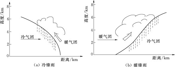 冷暖气团相遇,其交界面叫锋面,锋面与地面的相交地带叫锋,锋面随冷暖气团的移动而移动。当冷气团向暖气团推进时,因冷空气较重,冷气团楔进暖气团下方,将暖气团挤向上方,发生动力冷却而致雨,这种雨叫冷锋雨,如图4.1(a)所示。由于冷空气与地面的摩擦作用使锋面接近地面部分坡度很大,暖空气几乎被迫垂直上升,在冷锋前形成积雨云。因此冷锋雨一般强度大、历时短、雨区面积较小。