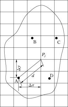 客观运行法又称为距离平方倒数法,由美国天气局于20世纪60年代末提出。先将流域分成若干网格,得出很多格点(交点),而后用邻近各雨量站的雨量资料确定各格点的雨量,再求出各格点雨量的算术平均值,即为流域平均降雨量,如图4.8所示。