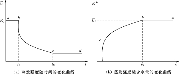 当降雨或灌水后,土壤的含水率非常大,接近饱和状态,此时根据土壤蒸发的特点和规律,可将其分为3个阶段,即稳定蒸发阶段,蒸发强度随含水率降低的阶段以及水汽扩散阶段,在大气蒸发强度不变的情况下,蒸发强度随时间和含水率的变化过程如图5.2所示。下面分别就这3个阶段进行分析。