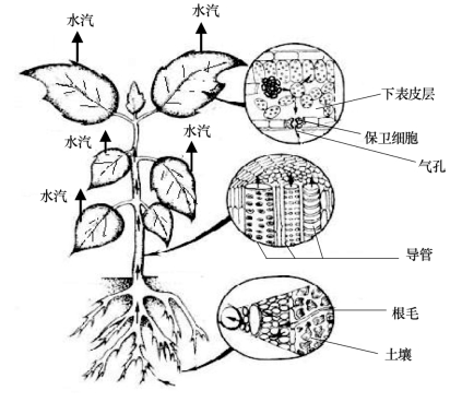 植物在进行散发时,首先是植物根系吸取土壤水分,水分通过植物茎内导管移动至叶部,然后在叶部气孔下腔的叶肉细胞内汽化并逸入空中,如图5.4所示。根压和散发拉力是植物散发的驱动力,所谓根压,就是指在根和土共存的系统中,由于根系中溶液浓度通常大于根系周围土壤中水的浓度,因而存在渗透压(也称为溶质势梯度)即根压。这种根压有时可高达十余个大气压,使得根系像水泵一样,不断地吸取土壤中的水分。散发拉力是指植物叶面因散发失水后,叶面气孔下腔的叶肉细胞水势降低,细胞的溶液浓度增大,渗透压增大,叶面的吸力增强,从而使得下面的细胞又向这一细胞开始输水,同样道理,这一细胞又从另一细胞吸水,依次传递下去,使得根部细胞的水势降低,与周围的土壤溶液之间的水势差扩大,进而影响根系的吸力。这种由于植物散发作用而使得土壤中水分源源不断地进入根部并向上传导的吸力,称为散发拉力。一般情况下,散发拉力是植物吸收水分的主要驱动力,只有当散发作用较小时,根压对水分上升才起较大的作用。