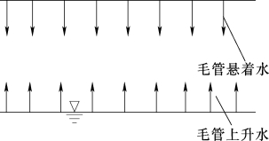 毛管水是指依靠毛细管的吸引力而被保持在土壤孔隙中的水分。根据其与地下水的关系,可将毛管水分为毛管上升水与毛管悬着水两类。在毛管力作用下,地下水沿着毛管孔隙上升进入非饱和带土壤中,此部分水称为毛管上升水。土壤孔隙越细,毛管力越大,毛管水的上升高度也越大。灌溉或降雨后,依靠毛管作用而保持在上层土壤细小孔隙中的水分,称为毛管悬着水。毛管悬着水的特点是呈“悬挂”状态存在于土层中,与地下水无毛管上联系。可以看出,毛管悬着水来源于地表水,毛管上升水来源于地下水,如图6.4所示。