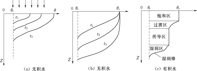 了解整个下渗过程中土壤含水率的动态变化及分布规律,有助于理解有关理论及计算方法。在地面土壤比较干燥,或者供水强度较小的情况下,降雨初期地表不会产生积水,所有水分都渗入土壤中。此时土壤表层的含水率不断增加,土层被湿润的部分也不断增厚,渗入土壤的水量将越来越多;土层内任意一点的土壤含水率都在时刻发生变化,具体特点是自供水所及之区域向四周递减,如图6.6(a)所示。随着入渗的进行,土表的含水率增加的幅度越来越小,并最终保持某一数值不变,但此时土表并未积水,土层内湿润部分的厚度仍然继续增加,但增加的幅度有所减小,土层内任一点土壤的含水率增加的幅度也逐渐减小,且越靠近土表,增幅越小,如图6.6(b)所示,此种情况是土壤表层开始积水的临界时刻。此后,部分水分开始在土壤表层集聚,并形成一定厚度,土壤的含水率剖面也基本趋于稳定。一般来说,在积水条件下,下渗水在土体中的垂向分布,大致可划分为4个区,即饱和区、过渡区、水分传导区和湿润区。如图6.6(c)所示,它们具体反映了下渗水的垂向运动特征。