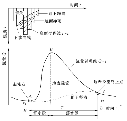 降水经历了流域产流、汇流两个阶段后,形成的河川径流过程与降雨过程就大不相同了,图7.2绘出了一次降雨径流过程,由于坡面漫流、壤中流和地下径流汇集到出口断面所需时间不同,因而洪水过程线的退水段上,各类径流终止时间不同;直接降落在河槽水面上的雨水所形成的径流最先终止,然后依次是地表径流、壤中流、浅层地下径流,最后是深层地下径流。