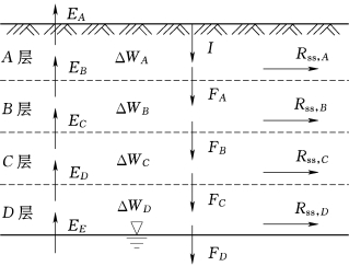 包气带水量平衡示意图如图7.4所示。降雨期内,ΔW>0,是水量增长期。而无雨期,I=0,则ΔW=-E-Rss-Fc,即ΔW<0,是水分消耗期。当Rss=0且Fc=0时,ΔW=-E,此时水分只消耗于蒸发。包气带的水量平衡方程式也可分层来建立。如图7.5所示,如果将包气带划分成A、B、C、D 4层,则不难写出各分层的水量平衡方程如下