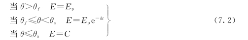(2)包气带水分的消耗。包气带的水分消耗也发生在其上、下界面处,在消耗过程中的水分运行方向与增长过程完全相反。上层水分主要消耗于土壤蒸发和植物散发。下界面处水分主要消耗通过内排水过程完成,但只有当包气带全层有自由重力水时才会出现内排水。因此在一般情况下,土壤蒸发和植物散发是包气带水分消耗的主要原因。根据蒸散发理论,蒸散发所消耗的水分取决于气象条件和土壤含水率。通常对土壤水分消退采用三段模式进行计算,见式(7.2)