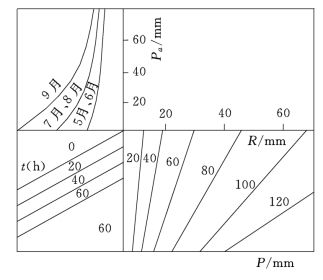 (1)降雨径流相关图。超渗地面径流的产流量,除了与当时的土壤含水量有关以外,还与降雨强度有关。所以其降雨径流相关图,需要加入反映雨强的参数,实际工作中常以一次暴雨的历时或有效历时表征该次暴雨的平均雨强。图7.13为五变量合轴降雨径流相关图,其关系可表达为R=f(P,Pa,t,月份),Pa为前期影响雨量,t为暴雨历时用于表征该次降雨的平均强度。但是实践证明,对于超渗地面径流产流类型,该相关图应用效果不好。原因在于,超渗产流的产流量主要取决于降雨过程中下渗强度与降雨强度的对比,而下渗强度受到很多随机因素的影响,相关图很难全面反映这些因素,所以这种相关图往往精度较差。