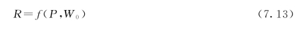 (2)蓄满产流计算模型。用特定数学方程描述流域蓄水容量面积分配曲线,如抛物线方程或指数方程,对于任一给定的降水量P和已知初始土壤含水率W0,可依据图7.7和图7.8所示的面积关系,用积分的方法求得相应的径流量R。当雨前流域平均初始蓄水量W0=0时,对于特定降雨量P,可按上述方法求得相应的R,从而可获得一条以W0=0为参数的P-R关系曲线,如图7.12所示。若流域平均初始蓄水量W0=W1,对于特定降雨量P,可利用蓄水容量面积分配曲线,采用上述同样的方法,也可求得相应的R,从而得到一条以W1为参数的P-R关系曲线,以此类推,可建立W0=W1,W2,W3,…时的P-R关系曲线簇,如图7.12(b)所示。
