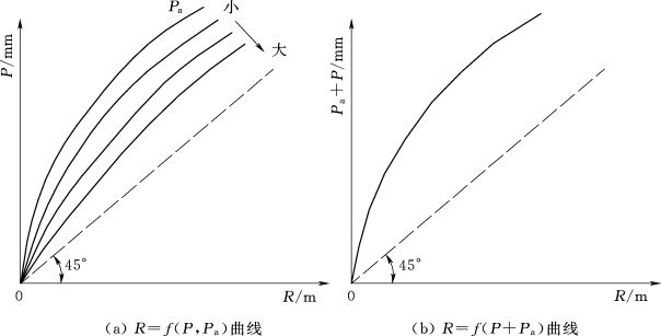 就整个流域而言,W0很难用实测土壤含水量值来表示,在建立经验相关图时,常用反映前期流域土壤含水量大小的指标Pa来表示,Pa又称为前期影响雨量。它可根据前期的降雨和蒸发来间接推算,至于推算的具体方法也将在水文情报预报中作详细介绍。相关图的形式如图7.11所示。其中,图7.11(a)为以Pa为参数的形式,即R=f(P,Pa);图7.11(b)为R=f(P+Pa)形式。
