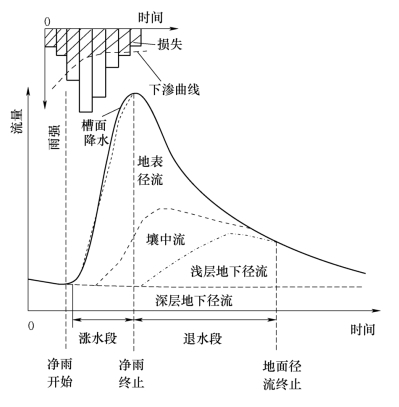 如前所述,一次降雨要经过流域蓄渗转化为坡面漫流,再通过河网汇流才形成流域出口断面的径流过程。降雨经历了产流、汇流在时间上的两次再分配之后,所形成的径流过程已与降雨过程大不相同。由于坡面漫流、壤中流和地下径流汇流所需时间不同,出口断面流量过程的退水段各种径流的终止时刻也不同。一般而言,直接降落在河网水面的雨水所形成的出流终止最早,地表径流次之,壤中流再次,终止最晚的是地下径流,如图7.16所示。