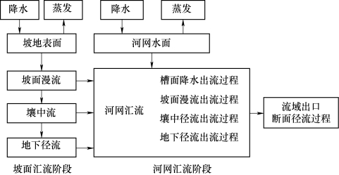 流域汇流指降落在流域内各处的雨水沿一定方向和路线演变成为出口断面流量的过程。由前面对径流形成过程的阐述可知,一次降水过程经历坡面蓄渗转化为坡面漫流及壤中径流,再经过河网汇流才形成流域出口断面的径流过程,图7.15以框图形式概括了流域汇流中的坡面汇流和河网汇流两个阶段,当然这种划分是为了便于理解和计算,实际上两个阶段相互交错,难以截然分割。