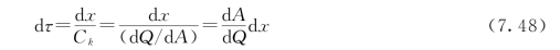 (4)河段洪水传播时间τ。洪水波在微小河段d x距离内的传播时间dτ为,且洪水波波速Ck=dQ/d A,可得