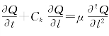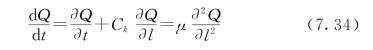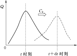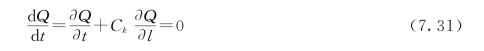式(7.34)、式(7.35)表示扩散波以波速Ck向下游传播,沿前进方向相应流量会产生变化,而变化程度取决于μ和∂2Q/∂l2两个因素,其中,μ为扩散系数,又称作衰减系数。当μ=0时,式(7.34)即为运动波方程,也就是说运动波属于扩散波的一个特例。