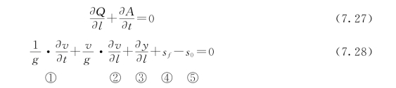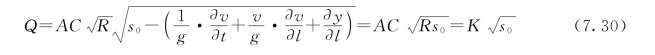 由于流量模数K是断面形状和水深的函数,式(7.30)表明对于特定断面,水位与流量呈单值关系,结合连续方程(7.27)可推导得