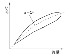 ,而Q<Q0。这表明在此条件下水位-流量关系不是单值函数,同一水位时将有两个流量与之对应。亦即一次洪水过程中,若按时间顺序连接,水位-流量关系是一条逆时针方向的绳套形曲线,如图7.20所示。而绳套的大小取决于∂y/∂l与s0的比值,一般而言,(1/s0)(∂y/∂l)越大,绳套也越大。