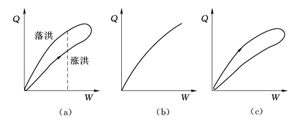 在洪水波条件下,槽蓄方程十分复杂。为了便于理解,假设河段的水位沿程分布呈直线,如图7.23(a)所示。当河段的中断面水位不变时,河段中槽蓄量也不变。这意味着,当河段水面线呈直线时,其中断面水位与河槽蓄量为单一关系,如图7.23(b)所示。但是,由于附加比降的影响,中断面水位与下断面流量存在3种关系。在中断面水位不变条件下:①下断面涨洪时的流量小于落洪时的流量,中断面水位与下断面流量呈逆时针绳套曲线关系;②下断面涨、落洪时的流量相等,中断面水位与下断面流量呈单值关系;③下断面涨洪流量大于落洪流量,中断面水位与下断面流量呈顺时针绳套曲线关系;分别如图7.24的(a)、(b)、(c)所示。这表明在特定河段,槽蓄量W与下断面流量Q的关系有可能成为单值关系。