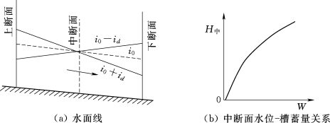 (2)槽蓄方程。河段的槽蓄水量取决于河段中水位的沿程分布状况,也就是水面曲线的形状。由于河段任意断面水位与流量存在着某种关系,故河段槽蓄水量是流量沿程分布和断面水位-流量关系的函数,称此函数为槽蓄方程。