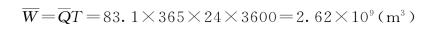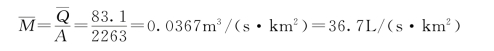 【例8.1】 某水文站控制流域面积为2263km2,已知该站的多年平均流量为83.1m3/s,该流域的多年平均降水量为1770mm,试求多年平均径流量,多年平均径流深,多年平均径流模数以及多年平均径流系数。