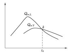 在无支流汇入的河段,上、下两相邻断面的流量过程线如图8.2所示,由图可见涨洪段上游流量大于下游流量,落洪段则是下游流量大于上游流量。由于洪水波的传播及变形,故下游站的洪峰Qm下晚于上游站的洪峰Qm上的出现时间,且Qm上>Qm下。洪峰过后,上游站的流量减少率大,下游站的减少率小,这样使上下断面两过程线的交点k位于两断面的洪峰之后,即交点k的相应时刻tk处,此时两相邻断面流量相等,即流量无沿程变化;即(∂Q/∂l)=0。而由连续方程式=0可知,当∂Q/∂l=0时,必然有∂A/∂t=B(∂h/∂t)=0,即∂h/∂t=0,这意味着tk时刻水位出现极值,即此刻下断面水位达到最高值。