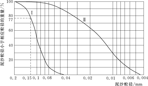 常用泥沙颗粒级配曲线来表征河流泥沙颗粒组成特征。这一曲线的横坐标为泥沙颗粒的直径,以mm计;纵坐标为小于这一直径泥沙在全部沙样中所占的重量百分数,如图9.1所示。从图中可以看出,曲线Ⅰ的斜率陡而曲线Ⅱ较缓,表明曲线Ⅱ代表的沙样粒径较细,但其粒径分布比较分散,而曲线Ⅰ代表的沙样粒径比较均匀,但是粒径分布比较集中;还可以看出,曲线Ⅰ代表的沙样中,粒径小于0.15mm的沙粒占全部沙重的77%。