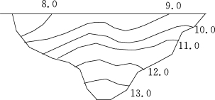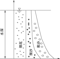 悬沙沿水深方向的分布因重力和水流紊动作用而不均匀,一般河底大,水面小,自下而上递减,如图9.3所示。洪、枯水期有所不同,洪水期泥沙多来自坡面土壤侵蚀,颗粒较细,垂向分布较均匀;枯水期泥沙则主要来自河槽冲刷,分布则不均匀。由于紊动流速与能量不断变化,造成同一位置不同时刻含沙量不同,称之为含沙量脉动;观测时需要维持一定时间以消除脉动影响。悬沙沿横断面的分布,一般主流以及局部冲刷位置的含沙量较大,两岸较小;河底较大,水面较小,如图9.4所示;且与季节、水位涨落及泥沙来源等因素有关。悬沙沿河长的变化与河道比降、流速以及流域产沙条件的沿程变化有关,故各条河流均不同。一般而言,下游河道比降变缓,断面加宽,流速减低,于是颗粒较大的泥沙由悬移质变为推移质乃至沉积于河底。悬沙粒径自上游向下游递减,下游的级配比上游均匀,但局部冲刷河段的悬沙粒径可能较粗,而处于淤积状态的河段,则悬沙粒径较细。