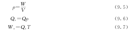 悬沙计量常用含沙量ρ、输沙率Qs和输沙量Ws来描述。含沙量ρ为单位体积浑水内所含泥沙的质量,以kg/m3计;而输沙率Qs则为单位时间内通过河流某断面的悬沙质量,以kg/s计;输沙量Ws为时段T内通过河流某断面的悬沙质量,以kg计。三者分别用式(9.5)、式(9.6)和式(9.7)计算。