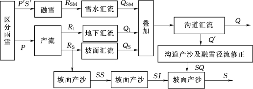 包为民等提出的水沙耦合概念模型基于流域降雨径流模型,分产流、汇流、产沙、输沙四大部分。由于研究流域地处旱区,以超渗产流为主,故采用变动径流系数方法以反映时段平均雨强和土壤缺水量对径流系数的影响。其基本结构如图9.7所示。