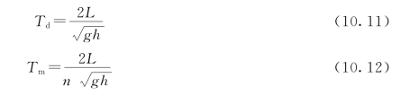 (2)波漾要素的计算。波漾可视为两种波长、周期相同而方向相反的波浪相互干涉的结果。波漾的波高为原波浪的两倍,但波长不变。波峰和波谷在波腹处交替出现,但在波节处只是湖面倾斜方向变化,水质点自身只作水平往复运动而无升降变化。单节与多节波漾周期的计算公式分别为式(10.11)和式(10.12)