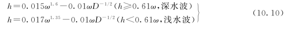 (5)风浪要素的计算。风浪要素可用仪器直接测定,或依据经验公式估算。通过实测资料的统计分析所建立的经验公式一般都考虑影响风浪的3个主要因素,即:吹程D,表示顺风向从岸边观测点到波浪发生处的距离,以km计;风速ω,以m/s计;水深h,以m计。例如,青海湖估算风浪(浅水波)的经验公式(适用范围D≤100km,ω≤16m/s)。