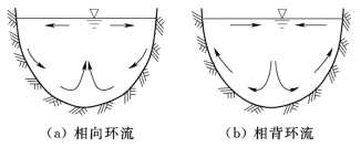 (2)梯度流。梯度流又分为重力流与密度流。重力流是由于湖面倾斜产生重力的水平分力所引起的湖水流动。由于进出湖泊的河水使湖面倾斜生成的重力流又称吞吐流。存在吞吐流时,湖中水位有变化。由于风所形成的水面倾斜引起的湖流称为常量流,因为风使湖水从一岸流向另一岸,但湖中水量并未发生变化。密度流是由于水温、湖水含沙量、含盐量等的差异产生水平压力梯度力所引起水质点运动,而形成的流动。当有垂直梯度时,就引起密度环流。当湖水温度变化时,湖中将产生密度环流。在增温期,沿岸水温较湖中间增加快,因此沿岸湖水密度相对要小,密度的压力梯度从湖心指向沿岸,湖中形成两个方向相向的环流(表层水流反向),如图10.9(a)所示。而在降温期,沿岸水温较湖中间降温快,沿岸湖水密度相对较大,压力梯度由岸边指向湖心,湖中形成两个方向相背(表层水流相向)的环流。如图10.9(b)所示。