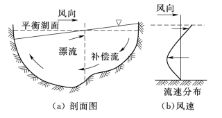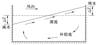 强风形成的漂流使湖泊的逆风岸水量积聚、水位上升,称为增水;背风岸水位下降,称为减水。两岸水位差使湖面倾斜,倾斜的湖面反过来又阻滞着漂流作用,并在水下形成与漂流方向相反的补偿流,如图10.10所示。形成了全湖性的垂直环流系统。在深水湖中,补偿流的范围可超过漂流的厚度。如果湖盆平缓,水的密度差别不大,补偿流的范围可达湖底。