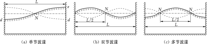 湖中发生波漾时,水体摆动,水面交替出现顺向或逆向倾斜。但总有一个或几个点的水位不发生变化,这些点称为节或振节。波漾多为单节,但也有双节和多节的。两振节间的水位变化幅度称为变幅,最大变幅称为波幅,如图10.7所示。