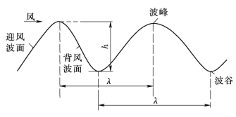 (1)波浪要素。波浪要素可用图10.4所示的要素表示,包括:①波高h,是指波峰与波谷间的垂直距离,m;②波长λ,是指两相邻波峰或波谷间的水平距离,m;③波速c,它是指波形中任一点在单位时间内传播的距离,m/s;④周期T,它是两相邻波峰或波谷通过空间同一点所需的时间,s;⑤波陡m,它是指波高与波长的比值。波长、波速、周期之间存在着下述关系,即