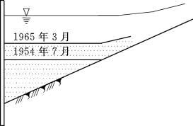 (2)浅滩的形成。在库岸崩坍过程中,大块的崩坍物滚落于岸脚处,粗颗粒的泥沙淤积于岸脚近处,颗粒细的泥沙在离岸较远的地方沉积。由于波浪作用在水面以下有其一定的影响范围,所以岸线不断后退,结果在原来岸线位置处形成侵蚀浅滩,淤积在岸脚附近的泥沙,则不断向外发展形成淤积浅滩。